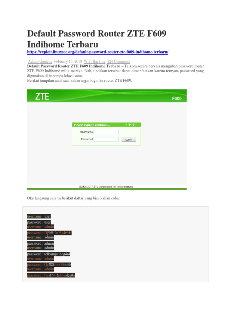 Default password router zte f609 indihome terbaru. Jika ada yang memiliki informasi lain terkait hal tersebut, silahkan tuliskan di kolom komentar, nanti akan saya tambahkan. Diakui atau tidak, saat ini anda hisup di zaman dimana kebutuhan internet sudah menjadi kebutuhan primer seperti halnya sandang, pangan. Kamu hanya perlu menyesuaikan saja. Terlihat username dan password dari routernya adalah admin:admin. Untuk default credential telnet zte f609 indihome. Sayangnya banyak pengguna indihome khususnya pengguna modem zte f609 atau f660 yang mengeluhkan adanya pergantian password yang dilakukan oleh. .password indihome modem zte mudah tanpa aplikasi tambahan anda bisa mengganti password indihome dengan modem tipe zte ganti password cara ganti password indihome indihome memiliki beberapa modem&router dan pemancar wifi,dan kamu datang ke website ini pasti kamu. Tapi sayangnya, tak jarang orang. Mengetahui password router zte f609 melalui telnet. Mengganti password wifi indihome lewat hp. Sebagai pengguna modem dari indihome, maka setidaknya kamu harus mengetahui update dari password modem zte. Look one column to the right of your router model number to see your zte router's user name.